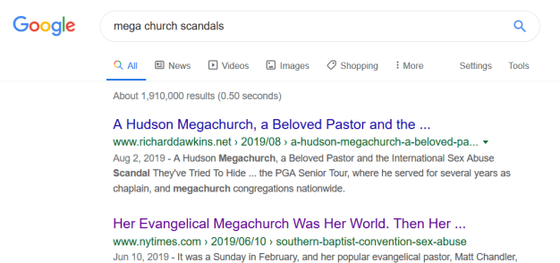 A quick Google search for scandals just in the ‘mega church’ shows 1,910,000 hits. Omit the words ‘mega church’ and you’ll get 39,200,000 hits. What is going on?